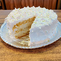 Massa branca com recheio de creme branco e coco fresco, coberto com marshmallow branco com coco fresco. |